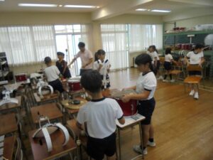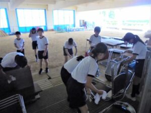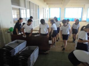 テント等の大きな物は、当日の内に保護者の皆様にご協力いただいてすでに片付け終わっているので、子供たちは、競技に使った道具を元の場所に仕舞ったり、机や椅子の脚を拭いて片付けたり、砂が入り込んだ場所をきれいに掃除したりといった仕事を分担して行いました。子供たちの表情には、大きな行事が終わってしまった寂しさと心地よい疲労感がにじんでいました。