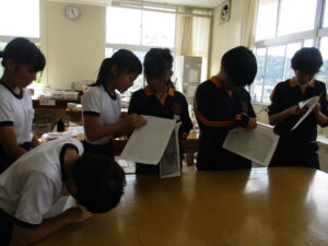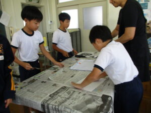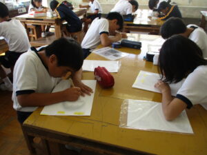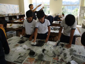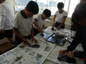 6年生は黒部市美術館から講師を招いて、「メディウムはがし刷り版画」の作り方を学びました。事前に書いていた自画像を専用の版に写し、刷る作業を行いました。いつもと違う版画に子供たちは興味津々で、出来映えに満足し、互いの作品のよさを認め合う姿も見られました。