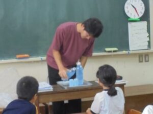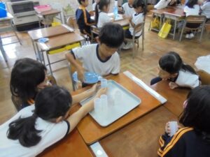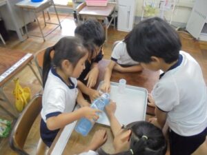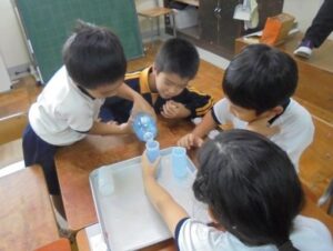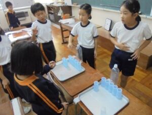 1年生は、算数科で2つの容器に入っている水のかさを比べる学習をしています。