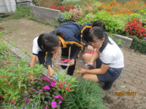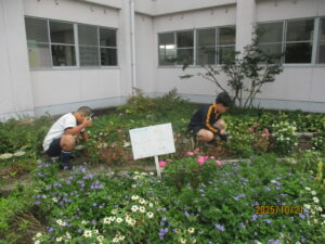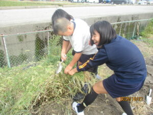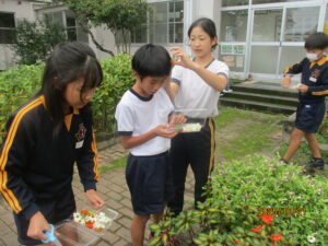 5年生は金曜日に予定している環境整備に向けて、野菜ランドとフラワーランドの整備をしました。野菜ランドでは、生い茂っている草を協力して抜きました。フラワーランドでは、綺麗に咲いていた花を摘み、それぞれオリジナルの「○○弁当」を作り、家に持ち帰りました。頭にかんざしのように花を付けて、帰っている子供も多くいました。フラワーランドに対する愛着が感じられ、嬉しくなりました。