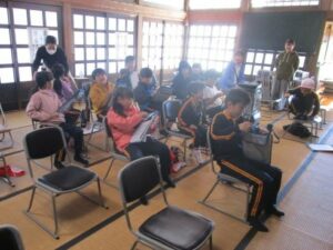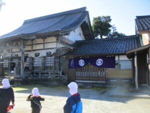 まずは、「寝てなる柿」の木を見せていただきました。「本当に寝てる」と子供たちは感動した様子でつぶやいていました。その後、紙芝居を読んでいただき、お寺ができるまでのお話や柿の木の伝説を学びました。立派な本堂の中も自由に見ることができ、子供たちはまた一つ、若栗のお宝を発見することができました。