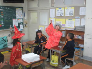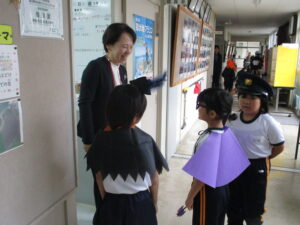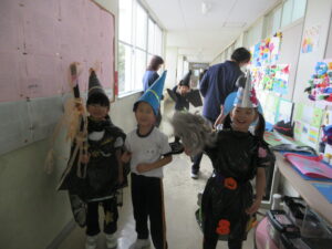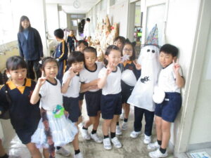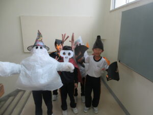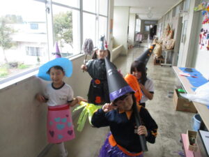 今日はハロウィーンです。学校にはたくさんのお化けや魔法使い等、仮装した可愛い子供たちがたくさん現れました。休み時間には、各教室に行き、「ハッピーハロウィーン」「トリックオアトリート」と言って自分の衣装をお披露目していました。特に1年生は図工の時間に家族と一緒に作った衣装なので、たくさんの人に見てもらって嬉しそうでした。