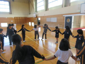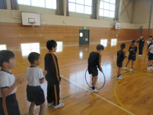 2年生のシャトルランの記録を4年生が数えました。2年生は1学期の記録よりも少しでも多く走ろうと頑張っていました。4年生は頑張る2年生の姿を見て、温かな言葉をかけていました。シャトルラン後は、交流会を行い、いろいろなフラフープ渡しをしました。チームで協力しながらフラフープを渡していました。これからも温かな関係作りを学年を越えて行っていきたいと思います。