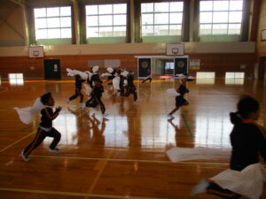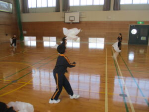 紙をもって走ったり、ちぎれた紙を使ってバンダナのようにしたりして体育室で思いっきり活動をしました。