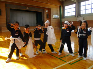 1年生は図画工作科の時間に、大きな紙の特徴を感じながら、体全体を使って活動する学習をしました。