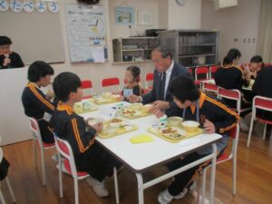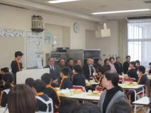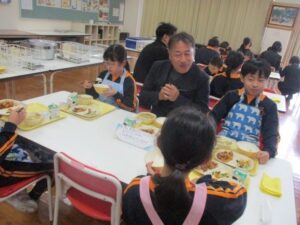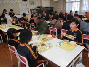 11月18日は、黒部地場産学校給食の日で、野菜等の生産者の方々や、学校に関わるたくさんのお客様に来ていただき、ふれあい給食会を行いました。