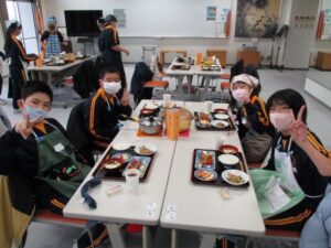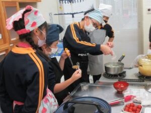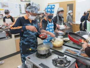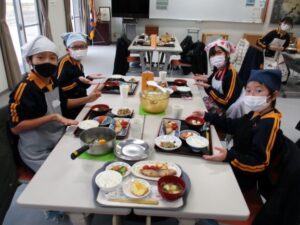 若埜ふれあいセンターで6年生の食育教室(名水キッズ料理教室)が行われました。6年生が作ったメニューは「ごはん、味噌汁、野菜のごま和え、ぶりの照り焼き、りんごのデザート」でした。6年生にとっては、昨年度に引き続き2度目の食育教室。慣れた手つきで野菜を切ったり、見通しをもって作業を進めたりする様子も見られました。地場産の食材を使って、とても豪華な昼食が出来上がり、子供たちは「おいしい!!」と感激しながら普段以上にたくさん食べていました。
