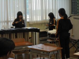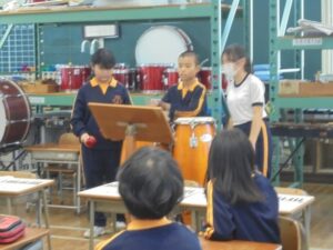 それぞれの打楽器がもつ音の特徴を感じ取り、グループで楽器の組み合わせやリズム、音の強弱等を工夫し、練習を重ねました。今日の発表会では、自分たちの表現したいイメージに近づけようと心を一つに演奏しました。聴いている子供たちも、よさを感じ取りながら真剣に耳をかたむけていました。