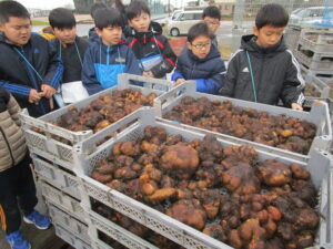 3年生は社会科「農家の仕事」の学習で、若栗地区の林農産に見学に行きました。農家の仕事の種類や仕事の工程などに着目して見学をしました。目の前に並んでいる里芋が給食のおかずとして届くことに驚いていました。見学を通して、生産に携わっている人々の仕事が詳しく分かり、これからの学習が深まりそうです。子供たちの気付いたことや考えたことを基に学習を進めていきます。