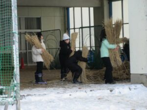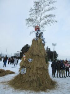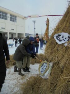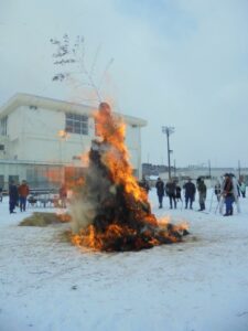 左義長は、児童クラブを中心に、PTAの保護者の方々、地域の消防団の方々、自治振興会や公民館の関係の方々にご協力いただき、毎年実施しています。今年は、大雪が心配されていましたが、奇跡的に晴れ間ものぞく絶好の左義長日和でした。たくさんの子供たちや地域の方々が、今年一年間の健康や幸福を願い、高々と上がる炎を見つめていました。