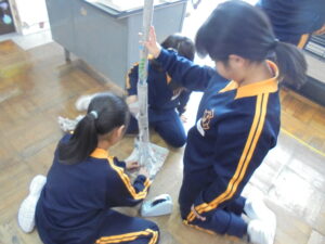 4年生は、グループでアイディアを出し合って「新聞タワー」の高さを競いました。