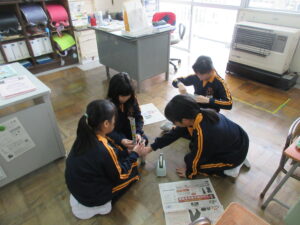 1日分の新聞とセロハンテープを使ってどのようにつなげ、固定すれば良いのか話し合っていました。