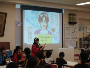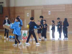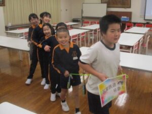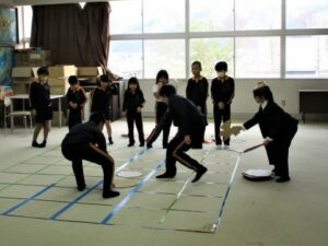 「富山県知事から手紙が届き、富山県の魅力をもっと広めるために、若栗鉄道に乗って県内市町村の見所を巡る」という設定で、「桃鉄」ならぬ「栗鉄」のゲームをしました。子供たちは、給食の縦割りグループの友達と一緒に、電車に見立てた縄の中に入り、サイコロを振って、校内のいたるところに用意してある市町村にまつわるクイズコーナーや体を動かすゲームコーナーを回りました。