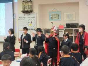 学年の違う子供たちが知恵を出し合い、協力してクイズやゲームに挑戦しながら、楽しく交流を深めることができました。また、6年生一人一人が、衣装を身に付けそれぞれの役になりきったり、みんなに楽しんでもらうために自分の役割を果たそうと頑張ったりする姿に、大きな成長を感じることができました。