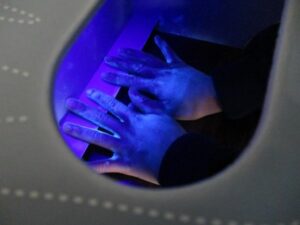 まずは、保健委員会の児童が手洗いの大切さについて話し、それを聞いてから各自で手洗いをします。その後、専用ライトを使って洗い残しの部分をチェックします。