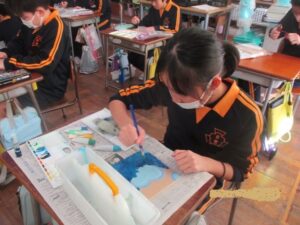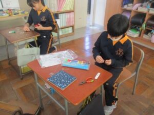 5年生は、図工で「ワイヤーワールド」と題して、針金を使った工作をしています。