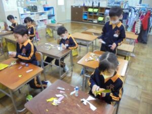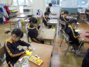 1年生は、6年生を送る会に向けて、6年生に渡すプレゼントのメダルを作っています。入学してからこれまで学校生活の様々な場面でやさしくお世話をしてくれたり、楽しく一緒に遊んでくれた6年生一人一人の顔を思い浮かべながら、心を込めて制作しています。6年生が喜んでくれるのを期待して、渡す日を楽しみにしている1年生でした。