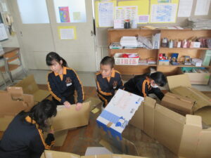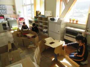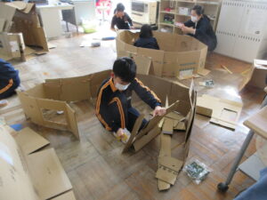 4年生は図画工作科の学習で「だんボールランド」を作りました。作りたい物を考えて段ボールを切り、家の形にしたり、友達同士で作ったものを繋げたり、楽しんで活動していました。作った後は、友達同士で作品を見合ったり遊んだりしました。子供たちの創造性に驚かされた時間でした。
