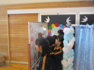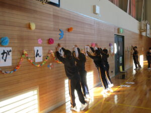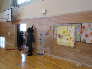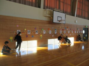 4・5年生は、今日送る会の会場づくりをしました。6年生に喜んでもらえるように気持ちを込めて飾りつけなどを協力して行っていました。