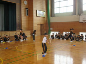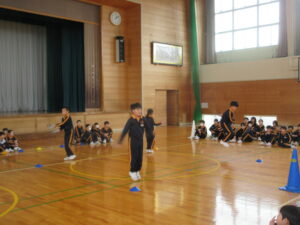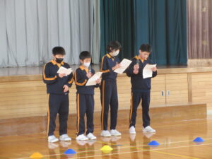 また、体育委員会の話では、なわとび運動の良さについて紹介してくれました。「体力がつく」「いろいろな技があり、できたときに達成感がある」「練習すればするほど上達する」「なわとびがあればどこでもできる」これからも朝活動や休み時間になわとび運動を進め、体力向上を目指していきたいと思います。