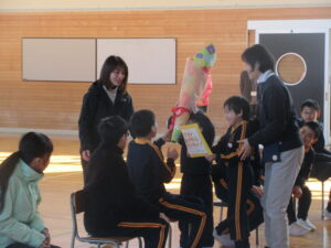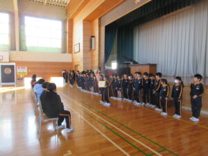 6年生に切り紙で作った花束を贈りました。一つ一つの花は、休み時間に希望者を募ってコツコツ作り、花束にした作品です。一人一人が6年生に感謝の気持ちを込めて作りました。たくさんの子供が6年生の前に来てくれたので、6年生は嬉しそうでした。卒業式まであと1週間、卒業式練習も力が入っています。温かな気持ちをいっぱいにして卒業式を迎えたいと思います。