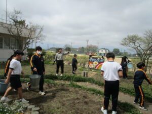 3・4年生がフラワーランドの草むしりをしました。今年もフラワーランドに素敵な花が咲くようにみんなで力を合わせて作業していました。