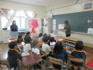 3年生の教室では、先生に「おむすびころりん」の読み聞かせをしてもらいました。